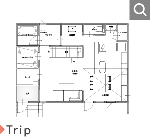 キッチンからランドリーまでが回遊でき、家事の負担を軽減。32坪とコンパクトながら吹抜けや大きな窓で開放感のある空間に。2Fにはフリースペースも完備。