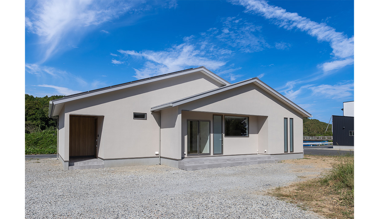 広々とした敷地に建つ、やわらかく優しい色合いの平屋。リビングとつながる広いテラスが印象的です。